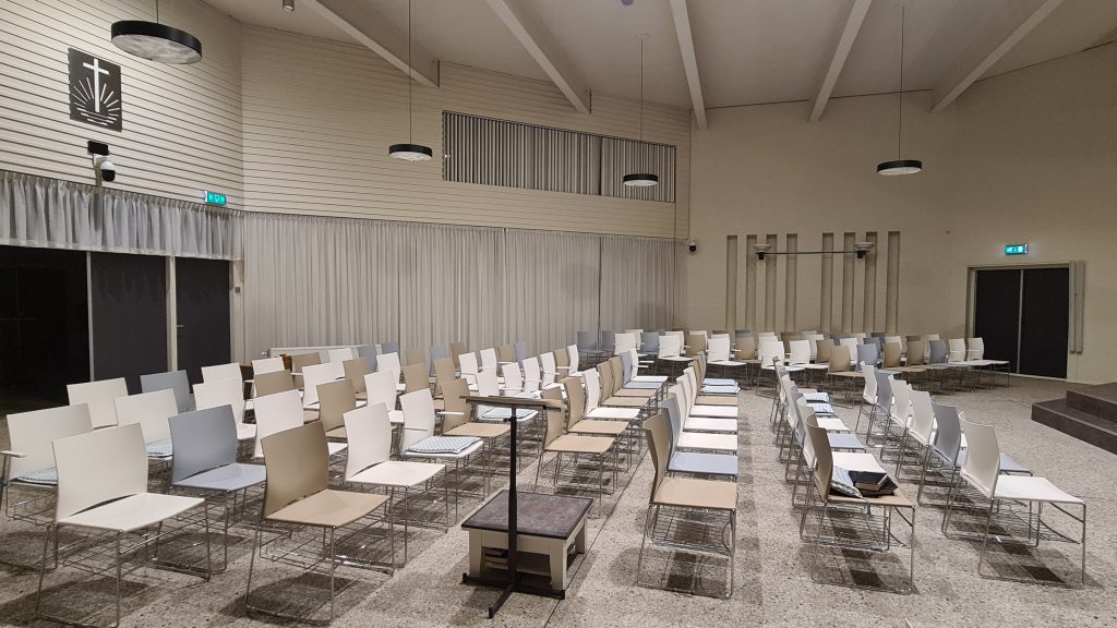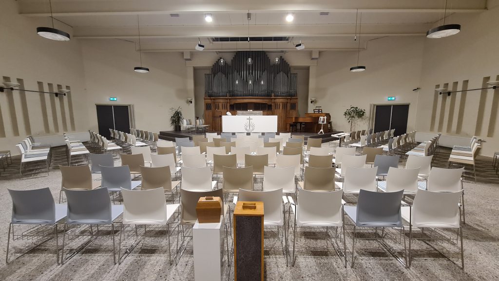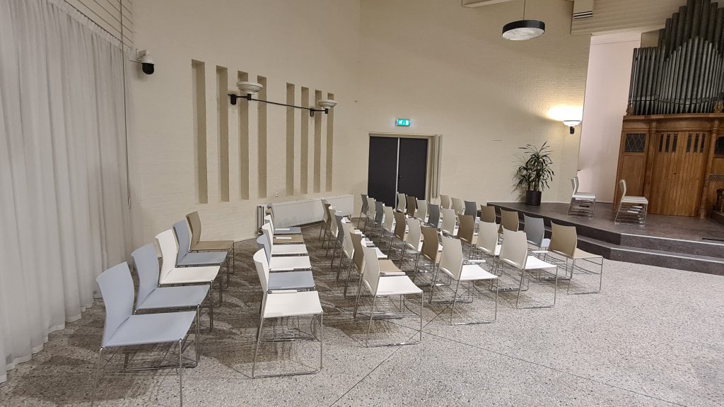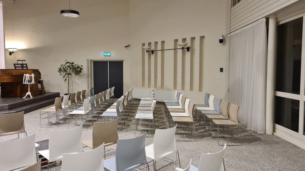 LET OP: De Kerkzaal is enkel bij uitzondering te gebruiken, i.v.m. de vaste zaalopstelling. De aanwezige instrumenten mogen niet zonder overleg gebruikt worden.
